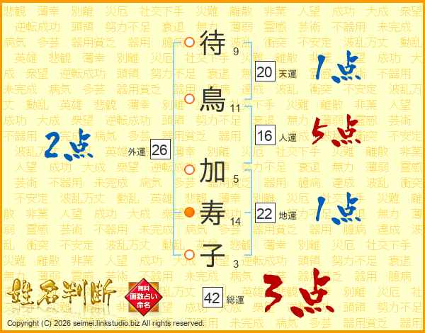 待(9画)鳥(11画) 加(5画)寿(14画)子(3画)