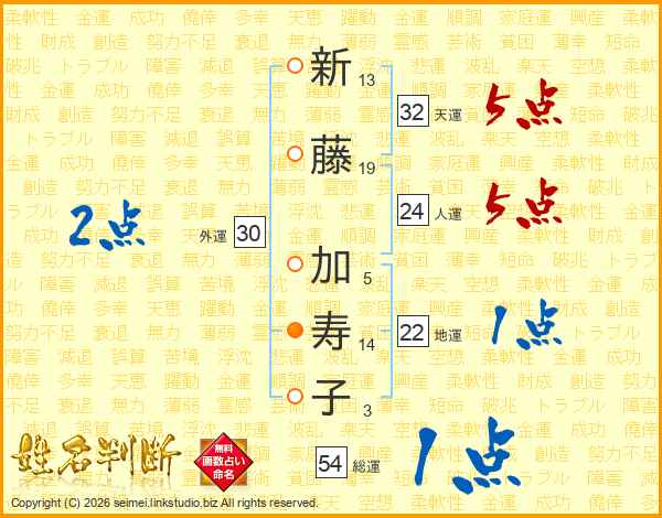 新(13画)藤(19画) 加(5画)寿(14画)子(3画)