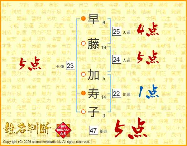 早(6画)藤(19画) 加(5画)寿(14画)子(3画)