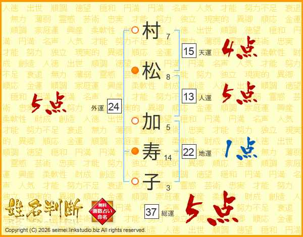 村(7画)松(8画) 加(5画)寿(14画)子(3画)