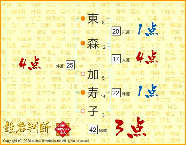 東(8画)森(12画) 加(5画)寿(14画)子(3画)