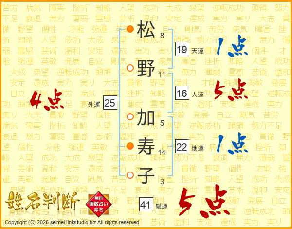松(8画)野(11画) 加(5画)寿(14画)子(3画)