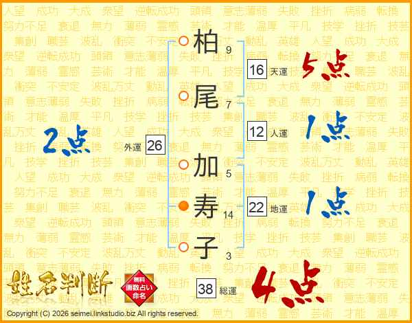 柏(9画)尾(7画) 加(5画)寿(14画)子(3画)