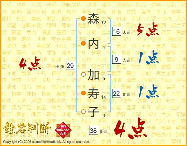 森(12画)内(4画) 加(5画)寿(14画)子(3画)