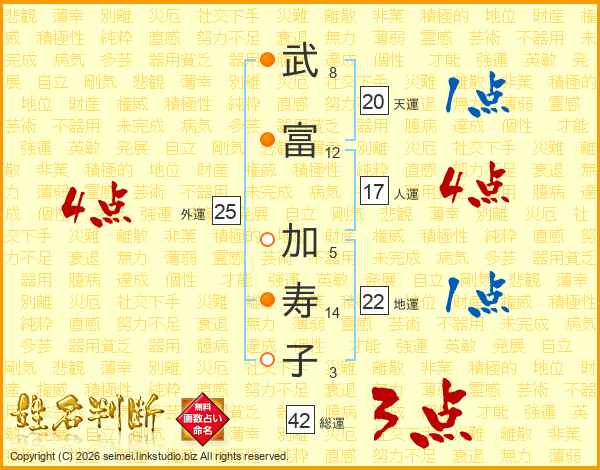 武(8画)富(12画) 加(5画)寿(14画)子(3画)