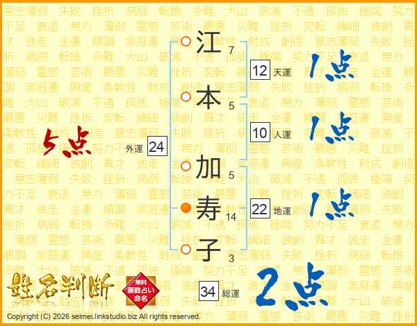 江(7画)本(5画) 加(5画)寿(14画)子(3画)