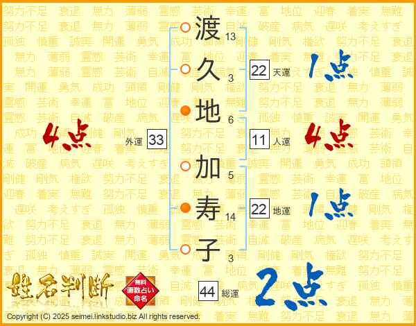 渡(13画)久(3画)地(6画) 加(5画)寿(14画)子(3画)