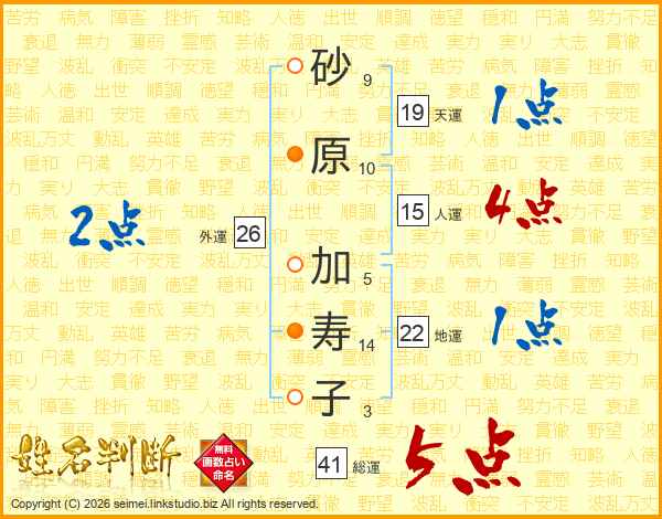 砂(9画)原(10画) 加(5画)寿(14画)子(3画)