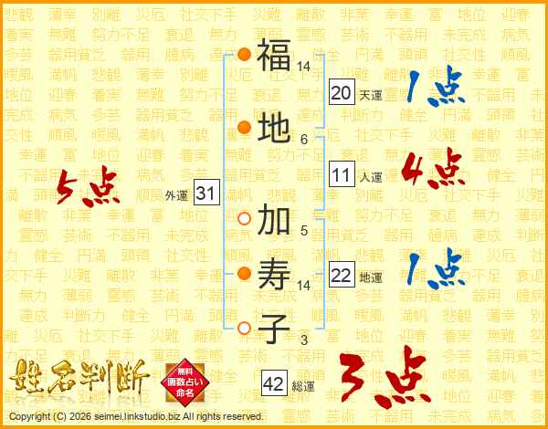 福(14画)地(6画) 加(5画)寿(14画)子(3画)