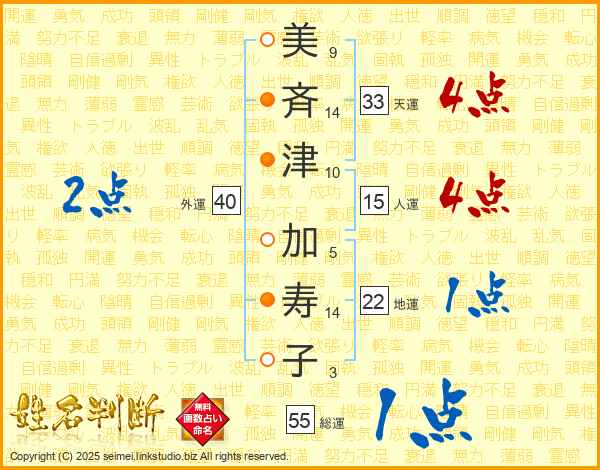 美(9画)斉(14画)津(10画) 加(5画)寿(14画)子(3画)