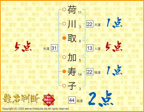 荷(11画)川(3画)取(8画) 加(5画)寿(14画)子(3画)