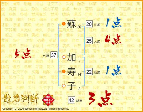 蘇(20画) 加(5画)寿(14画)子(3画)