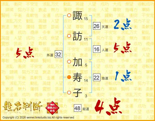 諏(15画)訪(11画) 加(5画)寿(14画)子(3画)
