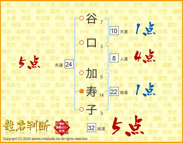 谷(7画)口(3画) 加(5画)寿(14画)子(3画)