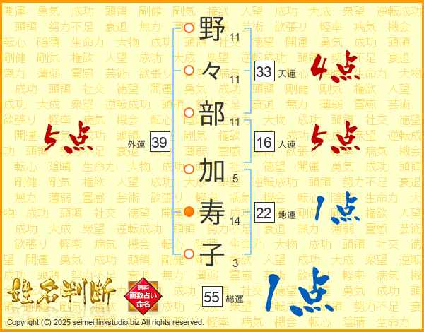 野(11画)々(11画)部(11画) 加(5画)寿(14画)子(3画)