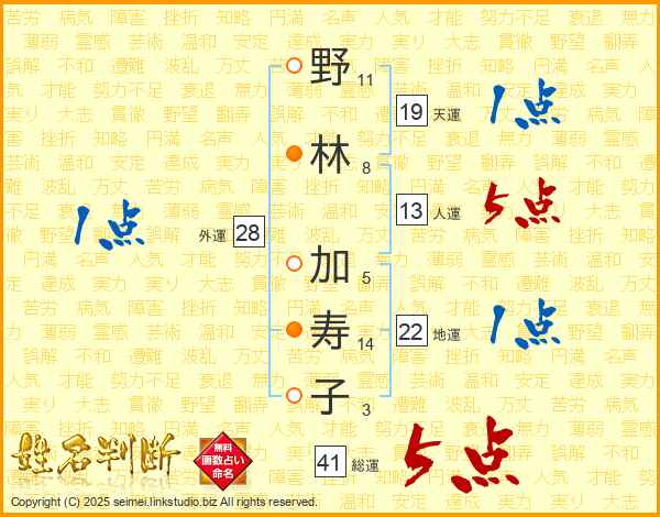 野(11画)林(8画) 加(5画)寿(14画)子(3画)