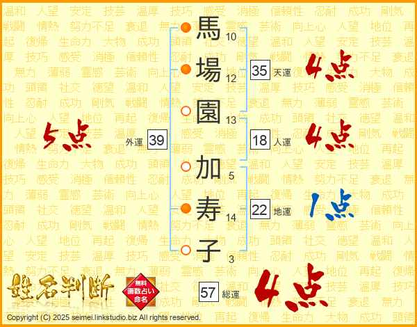 馬(10画)場(12画)園(13画) 加(5画)寿(14画)子(3画)