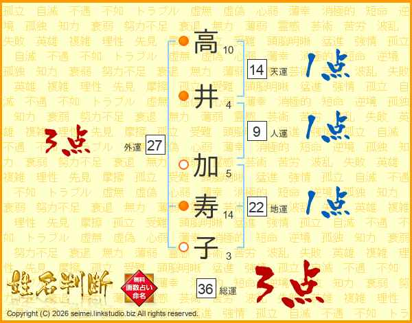 高(10画)井(4画) 加(5画)寿(14画)子(3画)