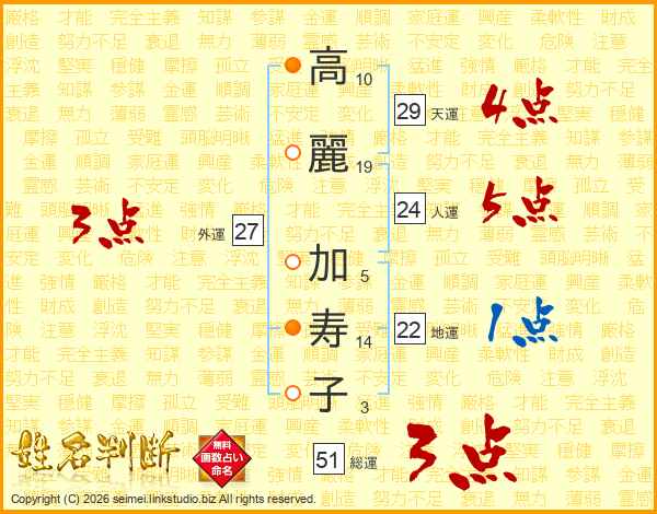 高麗加寿子さんの総運は51画の3点!