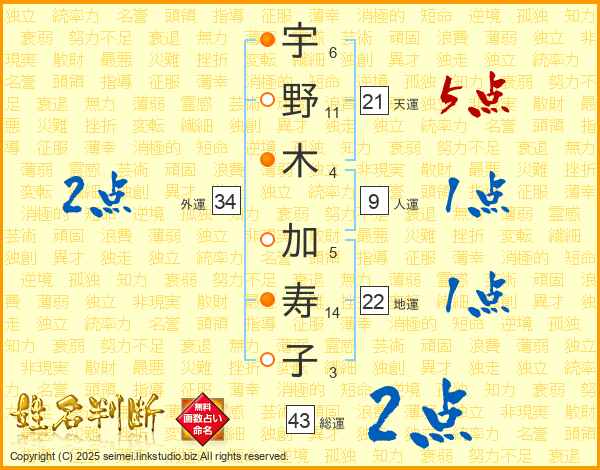 宇(6画)野(11画)木(4画) 加(5画)寿(14画)子(3画)