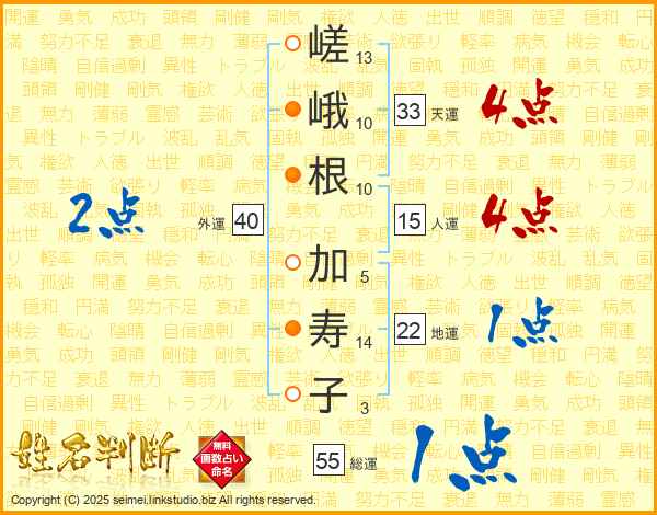 嵯(13画)峨(10画)根(10画)  加(5画)寿(14画)子(3画)