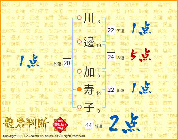 川(3画)邊(19画) 加(5画)寿(14画)子(3画)