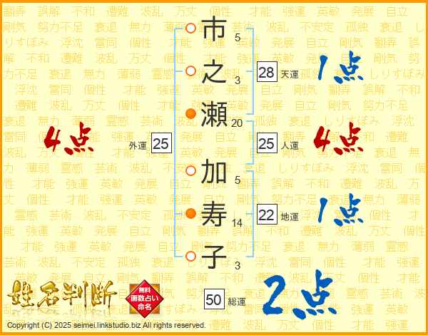 市之瀬加寿子さんの人運は25画の4点!