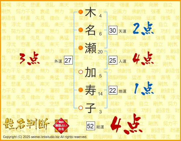 木(4画)名(6画)瀬(20画) 加(5画)寿(14画)子(3画)