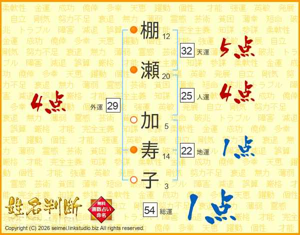 棚(12画)瀬(20画) 加(5画)寿(14画)子(3画)