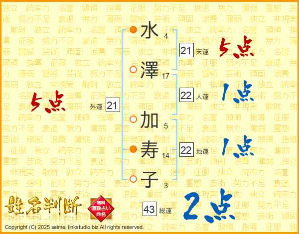 水(4画)澤(17画) 加(5画)寿(14画)子(3画)