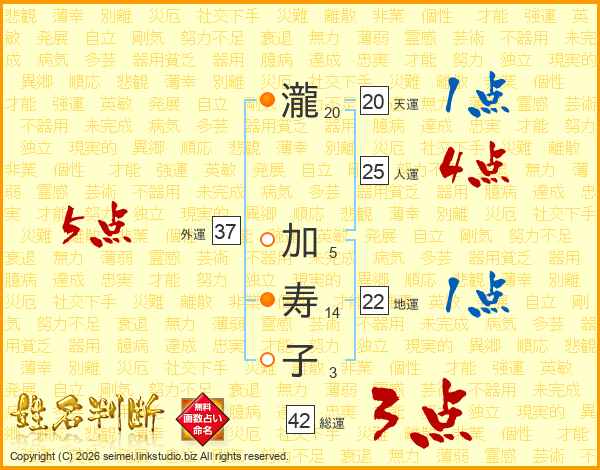 瀧(20画) 加(5画)寿(14画)子(3画)