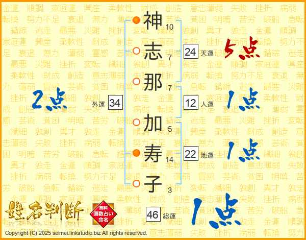 神(10画)志(7画)那(7画) 加(5画)寿(14画)子(3画)
