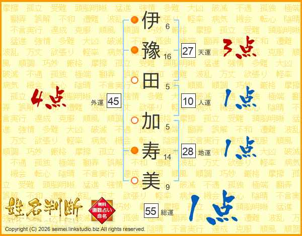 伊(6画)豫(16画)田(5画) 加(5画)寿(14画)美(9画)