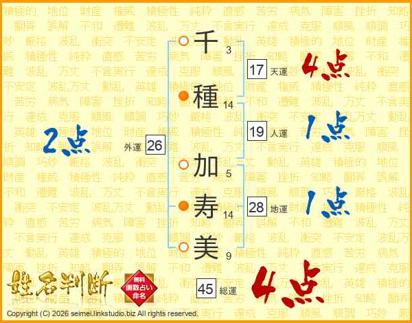 千(3画)種(14画) 加(5画)寿(14画)美(9画)