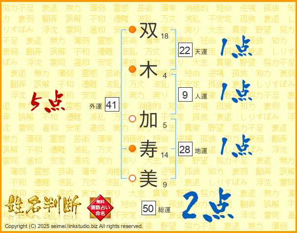 双(18画)木(4画) 加(5画)寿(14画)美(9画)