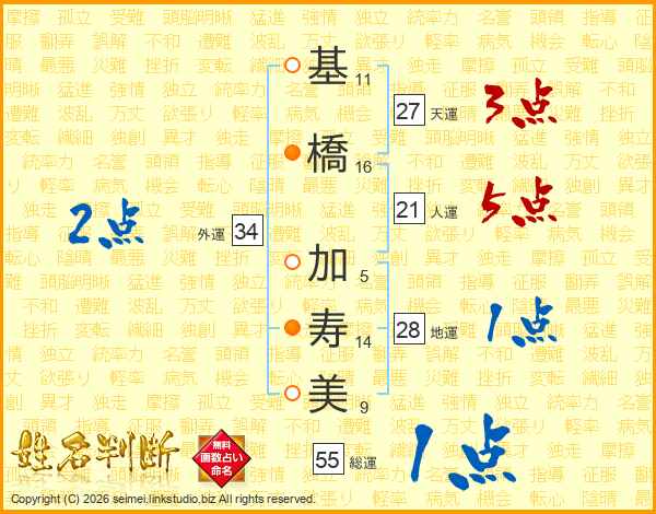 基(11画)橋(16画) 加(5画)寿(14画)美(9画)