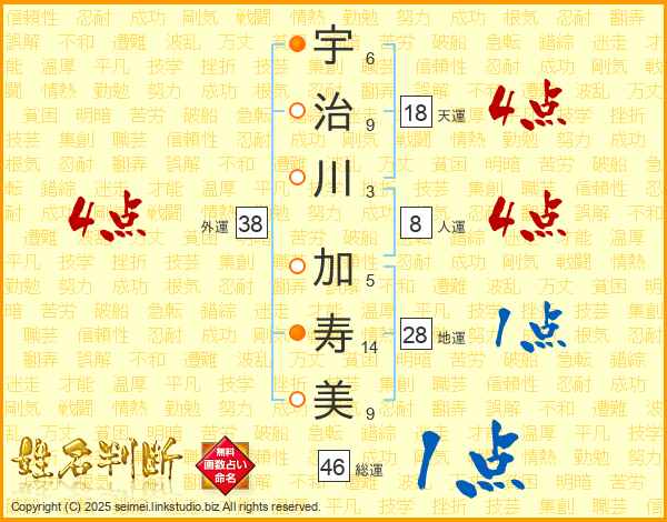 宇(6画)治(9画)川(3画) 加(5画)寿(14画)美(9画)