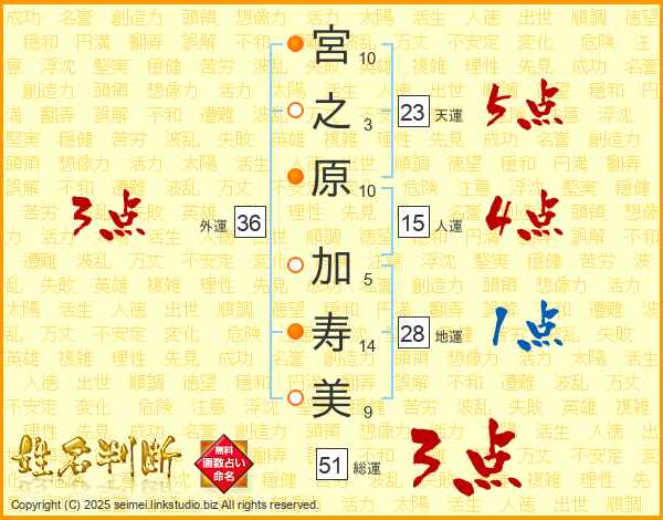 宮(10画)之(3画)原(10画) 加(5画)寿(14画)美(9画)