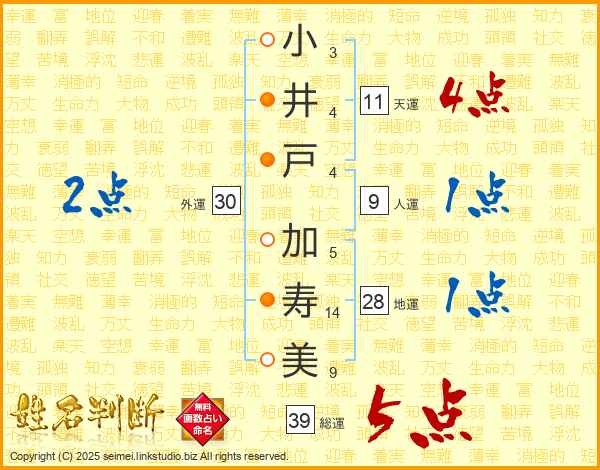 小(3画)井(4画)戸(4画) 加(5画)寿(14画)美(9画)
