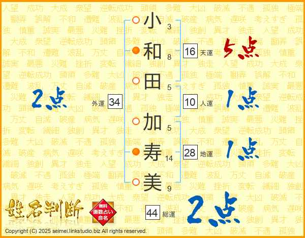 小(3画)和(8画)田(5画) 加(5画)寿(14画)美(9画)