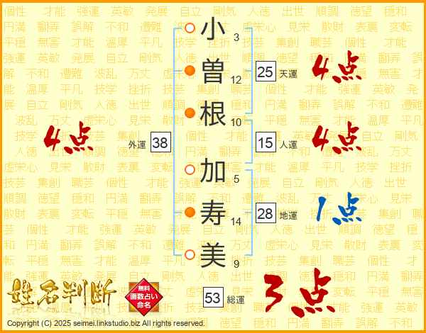 小(3画)曽(12画)根(10画) 加(5画)寿(14画)美(9画)