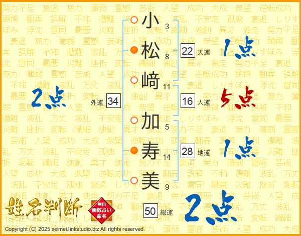 小(3画)松(8画)﨑(11画) 加(5画)寿(14画)美(9画)