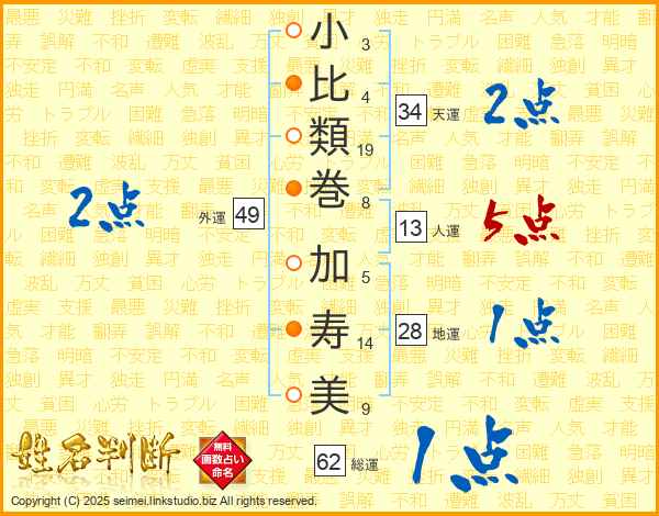 小(3画)比(4画)類(19画)巻(8画) 加(5画)寿(14画)美(9画)