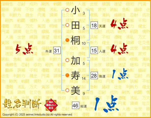 小(3画)田(5画)桐(10画) 加(5画)寿(14画)美(9画)