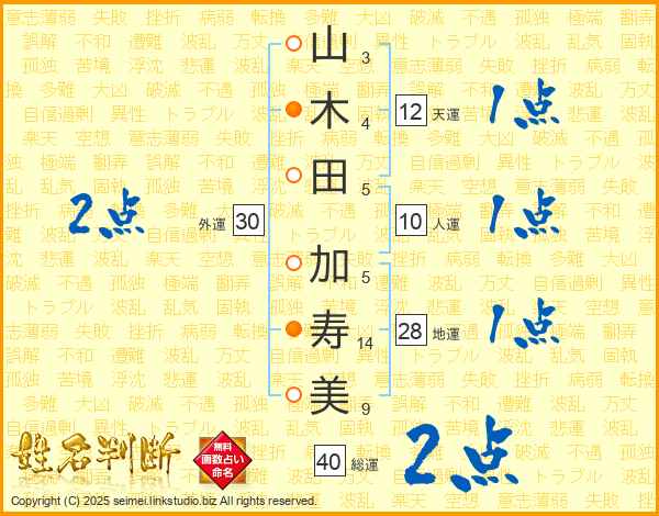 山(3画)木(4画)田(5画) 加(5画)寿(14画)美(9画)