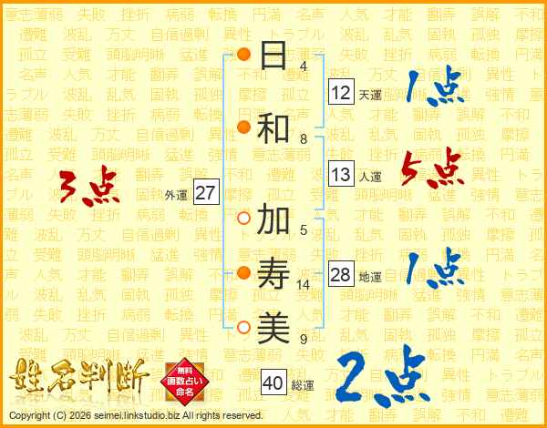 日(4画)和(8画) 加(5画)寿(14画)美(9画)