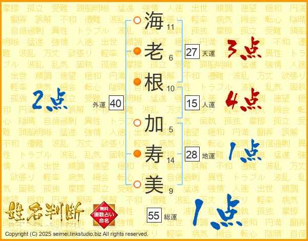 海(11画)老(6画)根(10画) 加(5画)寿(14画)美(9画)