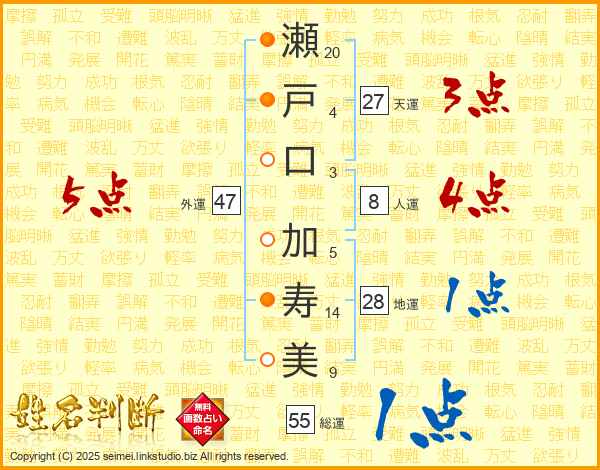 瀬(20画)戸(4画)口(3画) 加(5画)寿(14画)美(9画)