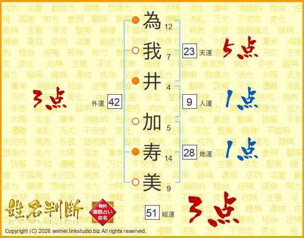 為(12画)我(7画)井(4画) 加(5画)寿(14画)美(9画)