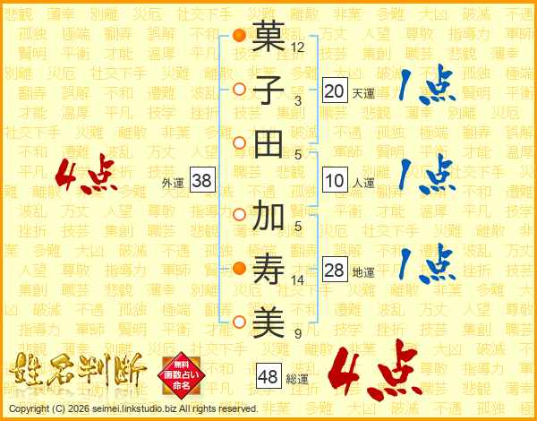 菓(12画)子(3画)田(5画) 加(5画)寿(14画)美(9画)